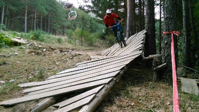 Durante el día de ayer no nos metimos en las rojas de la zona boscosa. Son muy inclinada técnicas y agotadoras; complicados trancos, zigzagueando por entre pinos, rocas y raíces; pero hoy sí le metimos mano, incluso hicimos unos últimos trankos tan tremendos que no se ni cómo salimos vivos de ellos, y volvimos a repetirlos, incluso me animé a hacer el salto final de rampa que está justo donde está el telesillas, y que tantas veces hizo Gilo y que ayer no me atrevía hacer. Cada bajada lo repetí, llegué a hacerlo hasta con solvencia jajaja.